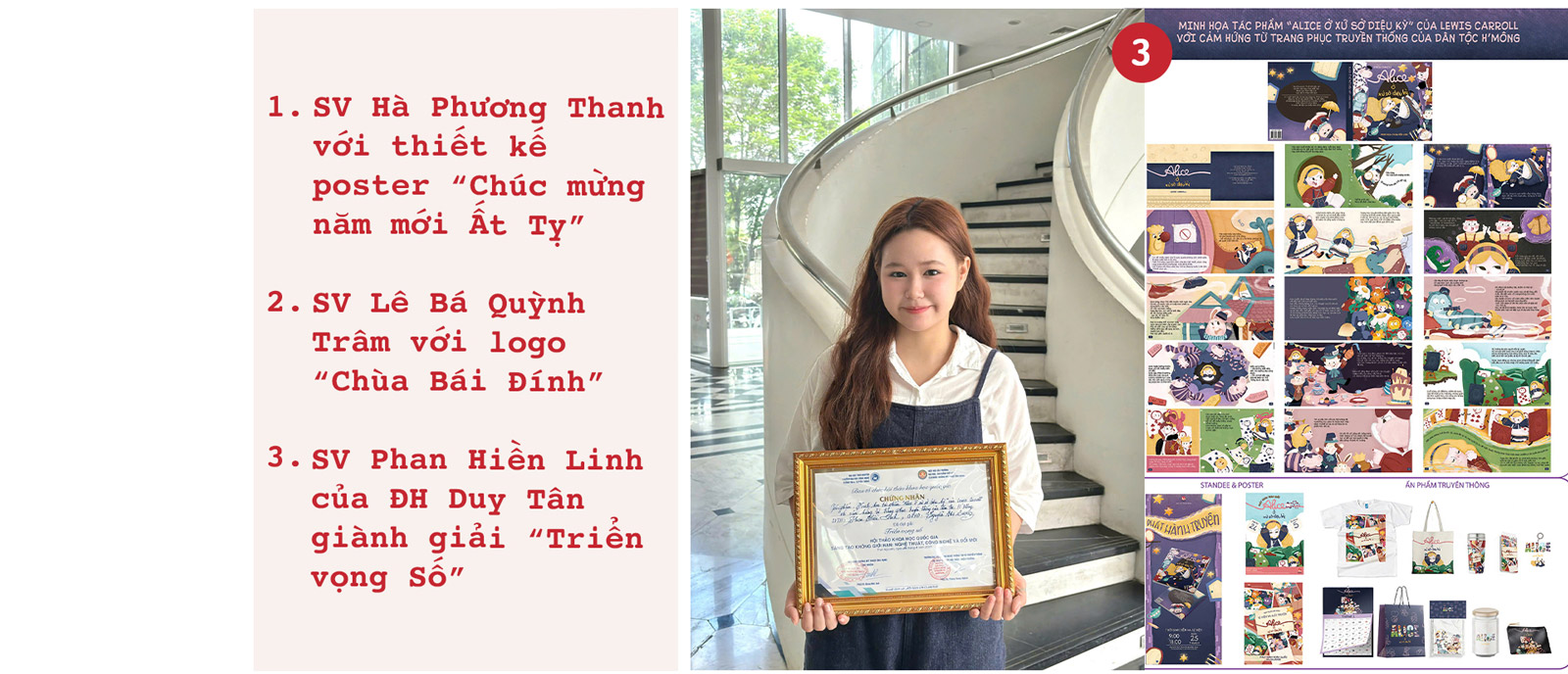 + Đồ án Tốt nghiệp của SV Thiết kế Đồ họa cũng đã giành giải "Triển vọng Số" tại Triển lãm thuộc khuôn khổ Hội thảo Khoa học Quốc gia "Sáng tạo không giới hạn: Nghệ thuật, Công nghệ và Đổi mới" năm 2025. Những nét vẽ mới mẻ khi "khoác áo mới" cho các nhân vật trong "Alice ở xứ sở diệu kỳ" bằng các trang phục truyền thống của người H'Mông đã thể hiện mong muốn của Hiền Linh trong việc truyền cảm hứng sáng tạo, góp phần gìn giữ và lan tỏa các giá trị văn hóa dân tộc Việt Nam.