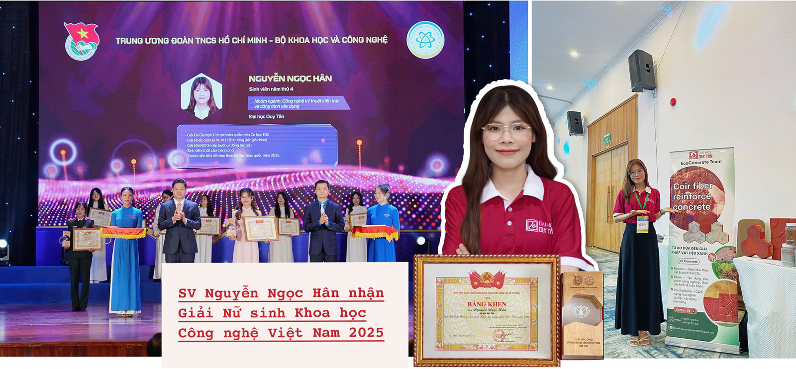 SV Nguyễn Ngọc Hân, ngành Kỹ thuật Xây dựng - ĐH Duy Tân đã vinh dự được trao Giải thưởng Nữ sinh Khoa học Công nghệ Việt Nam 2025 tại Lễ Trao giải do Trung ương Đoàn TNCS Hồ Chí Minh phối hợp với Bộ Khoa học - Công nghệ tổ chức.