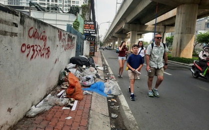 Vỉa hè đường song hành Võ Nguyên Giáp, phường An Khánh, TP HCM trở thành nơi đổ rác thải, vừa gây ô nhiễm vừa chiếm hết lối đi bộ (ảnh).