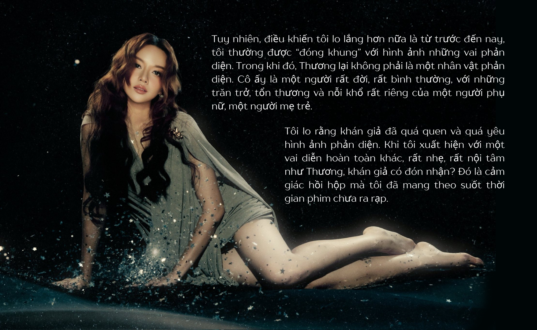 Tôi chủ động từ chối rất nhiều kịch bản và dự án có màu sắc tương tự, chỉ để chờ đợi một vai diễn khác biệt. Và cuối cùng, tôi gặp được Thương, một nhân vật hoàn toàn khác: khác về thân phận, khác về tính cách, khác về cảm xúc.