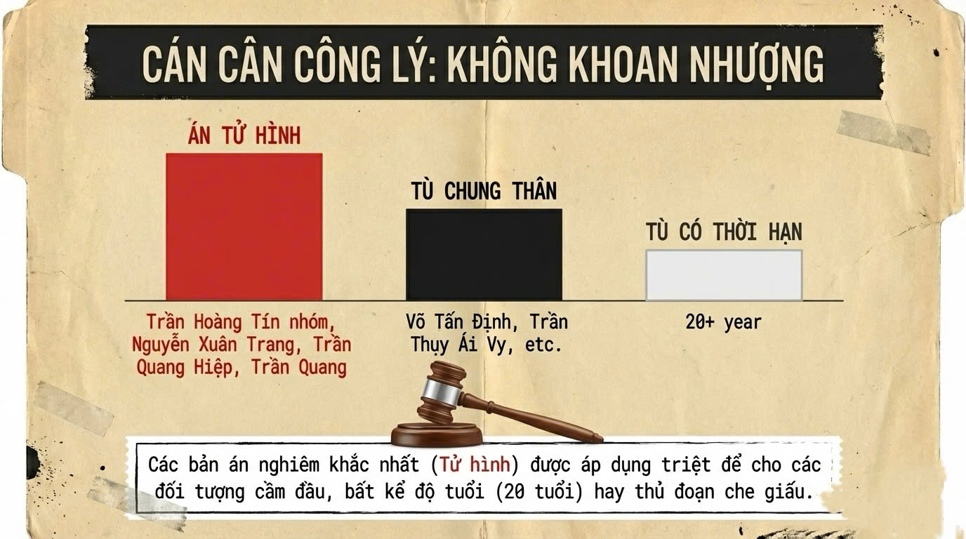 HĐXX tuyên tử hình Trần Quang Hiệp; 3 bị cáo lãnh án chung thân; một bị cáo khác bị phạt 7 năm 6 tháng tù. Riêng đối tượng "Bi" chưa đủ căn cứ xử lý do chưa xác định được nhân thân.