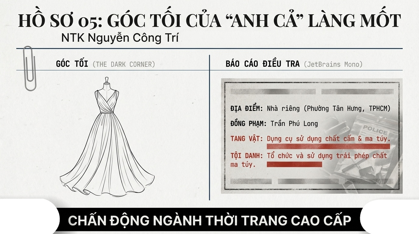 Nhà thiết kế thời trang nổi tiếng được mệnh danh "anh cả" của làng mốt Nguyễn Công Trí bị Cơ quan CSĐT Công an TPHCM bắt giữ vào ngày 23-6-2025 trong quá trình mở rộng chuyên án triệt phá một đường dây mua bán và tổ chức sử dụng trái phép chất ma túy.