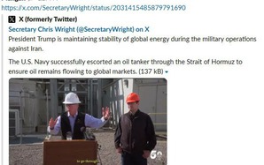 (NLĐO) - Bộ trưởng Năng lượng Chris Wright đăng tin không chính xác nói rằng “Hải quân Mỹ đã hộ tống tàu chở dầu đi qua eo biển Hormuz” hiện do Iran kiểm soát.