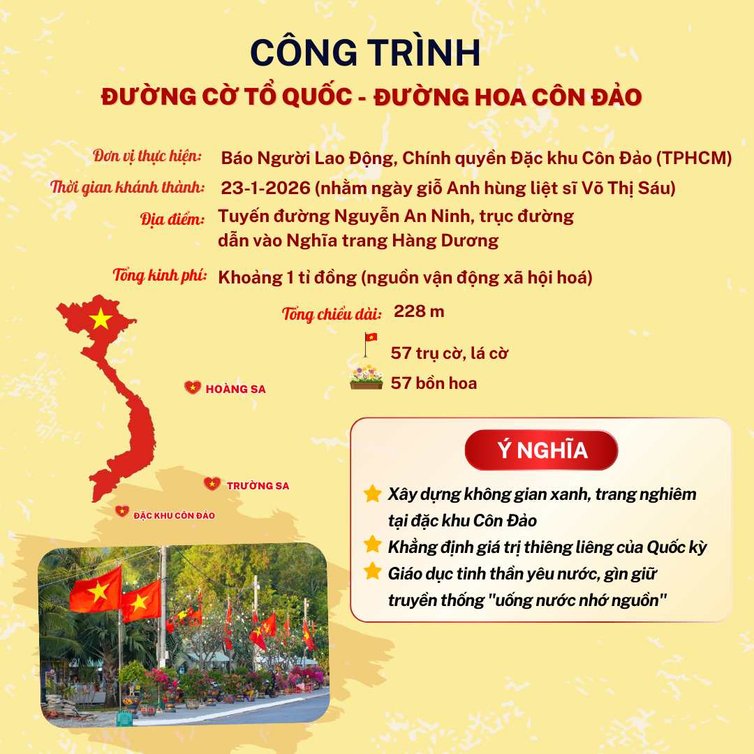 Ngày 23-1-2026, đúng Ngày giỗ của nữ Anh hùng Lực lượng vũ trang nhân dân Võ Thị Sáu (23.1.1952 – 23.1.2026), tại tuyến đường Nguyễn An Ninh – trục đường dẫn vào Nghĩa trang Hàng Dương (Đặc khu Côn Đảo), Báo Người Lao Động phối hợp cùng chính quyền địa phương long trọng tổ chức lễ khánh thành công trình "Đường cờ Tổ quốc – Đường hoa Côn Đảo"