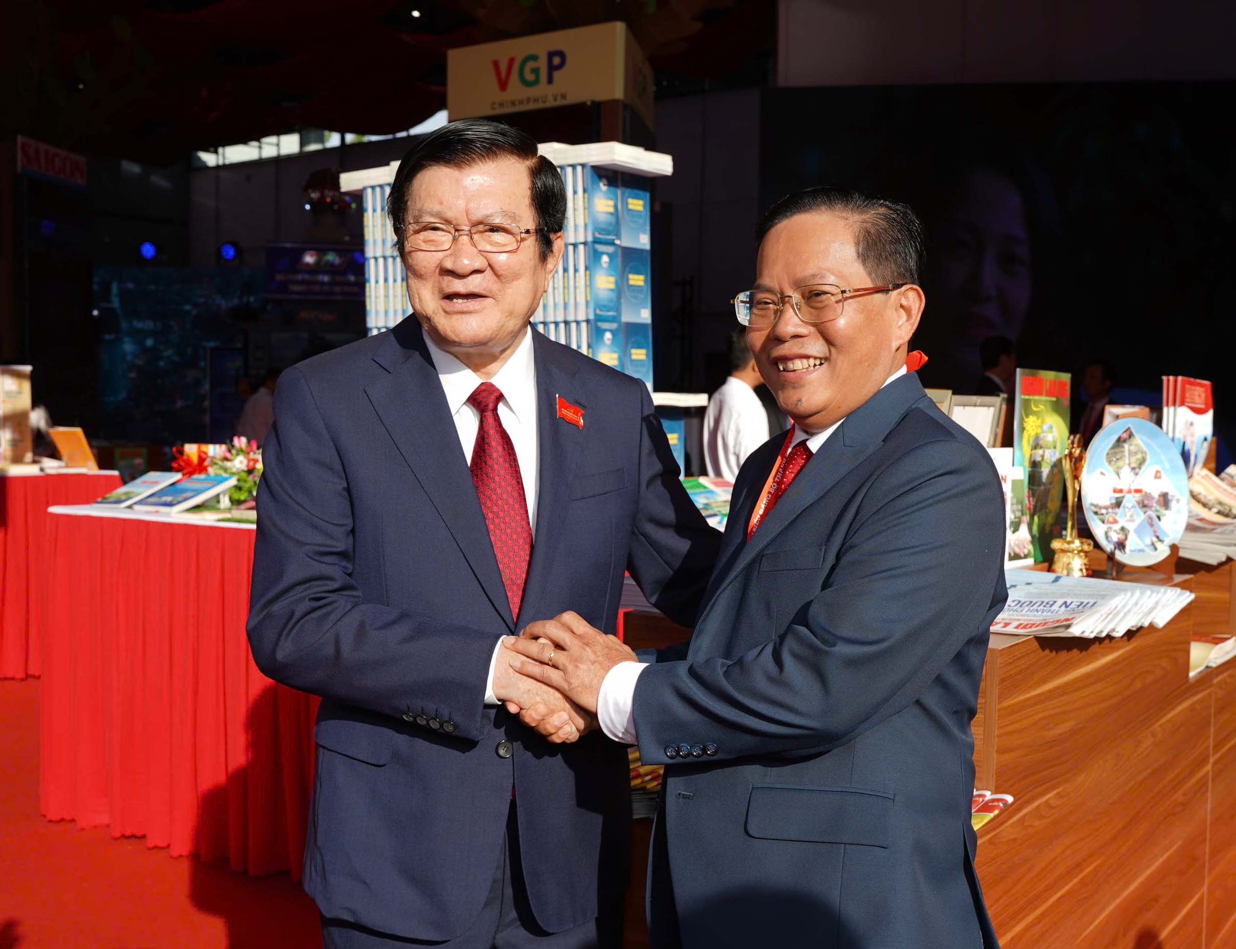 Chủ nhiệm Ủy ban Kinh tế và Tài chính của Quốc hội Phan Văn Mãi và ông Nguyễn Tiến Hải, Bí thư Tỉnh ủy An Giang, thăm khu trưng bày Báo Người Lao Động tại Đại hội